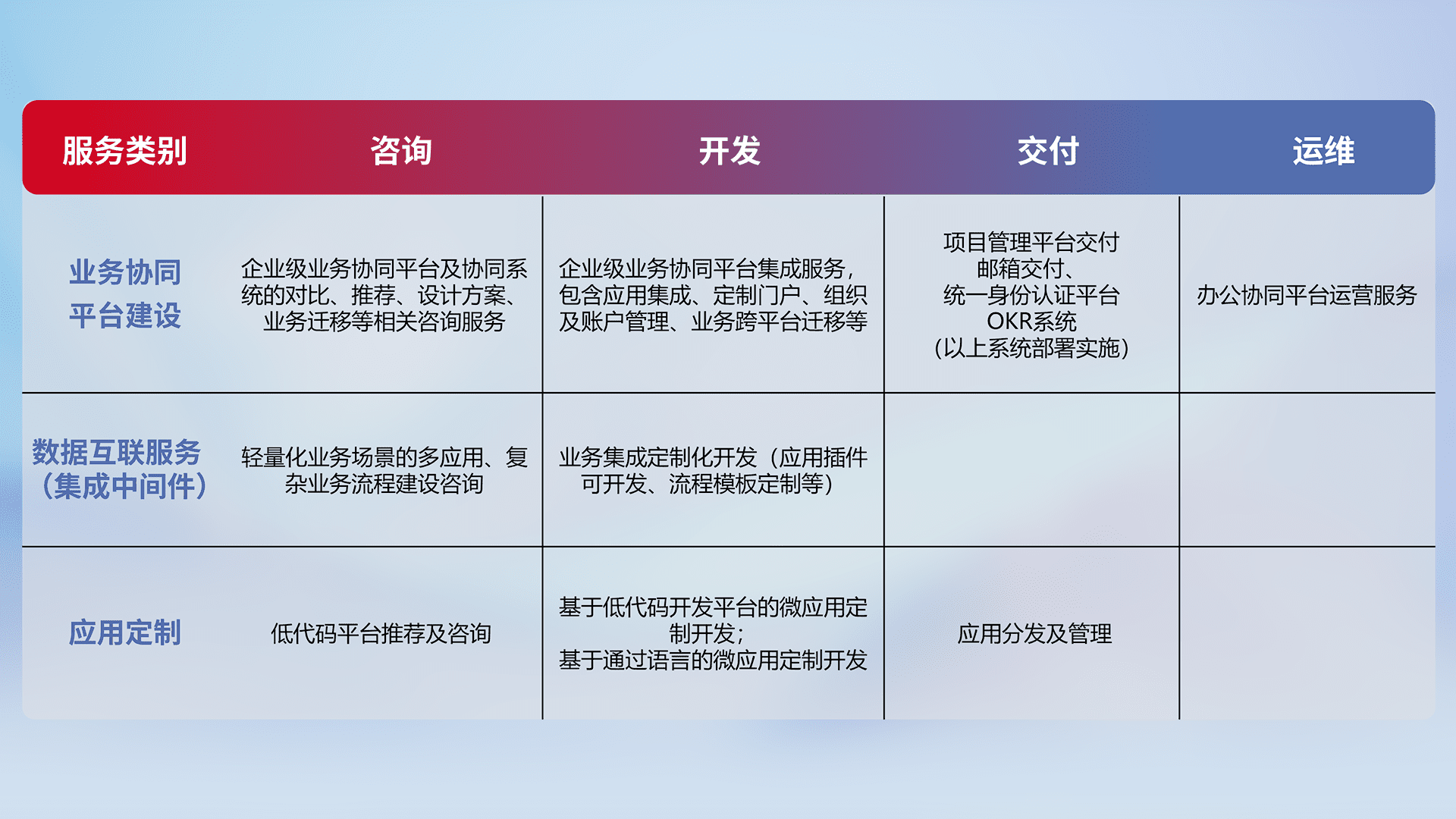 针对钉钉、、、、企微、、、、IDaas等平台级产品提供产品的规划、、方案、、、交付、、定制化开发等服务,,实现如统一协同办公、、智能客户服务、、、、混合会议管理、、智能数据查询、、、、等业务场景,,,实现数字化转型。。。